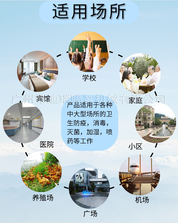 噴霧系統(tǒng)運(yùn)用的案例含噴霧消毒、人造霧景觀、噴霧除臭、除塵等。
